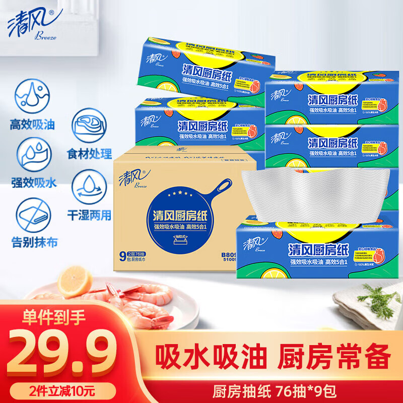 清风厨房抽纸76抽*9包 加厚 一次性吸油纸 厨房用纸 新老品随机发货